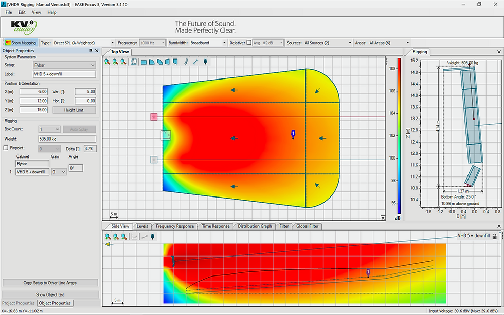 In addition, today it is possible to create a three-dimensional model of the space and, from that, an acoustic model in dedicated software (we rely on the technical department at KV2-Audio, who use EASE). Such an acoustic model can provide the information we need to ensure complete coverage of the space and to accurately assess sound intensity at each point.
